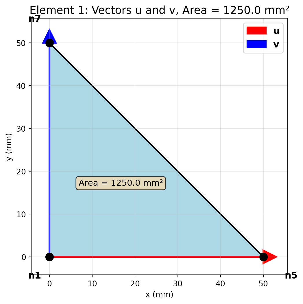 Since we know the x-, y- and z-coordinates of each node in every element, we can utilize linear algebra to compute the area from the vector product of the element sides. Recall that the vector product \(\mathbf{u} \times \mathbf{v}\) is a new vector \(\mathbf{w}\) (perpendicular to both \(\mathbf{u}\) and \(\mathbf{v}\)) whose magnitude \(||\mathbf{w}|| = \sqrt{w_x^2 + w_y^2 + w_z^2}\) represents the area of the parallellogram defined by \(\mathbf{u}\) and \(\mathbf{v}\) as sides. The area of a triangular element is therefore \(A_i = \frac{1}{2}||\mathbf{w}||\).