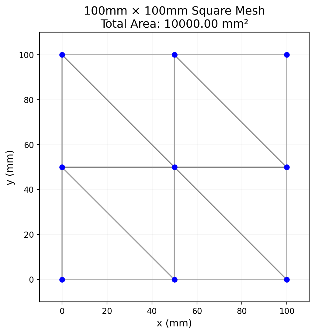 # Compute total areaarea =0for iel, nodes, coords in mesh.iter_elements():# iter_elements() yields: element_number, node_IDs, node_coordinates# Extract the three node coordinates for this triangular element n1 = coords[0] # first node coordinates n2 = coords[1] # second node coordinates n3 = coords[2] # third node coordinates# Compute edge vectors and area u = n2 - n1 # triangle edge vector 1 v = n3 - n1 # triangle edge vector 2 w = np.cross(u, v) # perpendicular to triangle area_e =0.5* np.linalg.norm(w) # area of current element area += area_e # add to total areaprint(f"Total computed area: {area:.2f} mm²")print(f"Expected area: {100*100:.2f} mm² (100mm × 100mm square)")print(f"Verification: Error = {abs(area -10000):.6f} mm²")