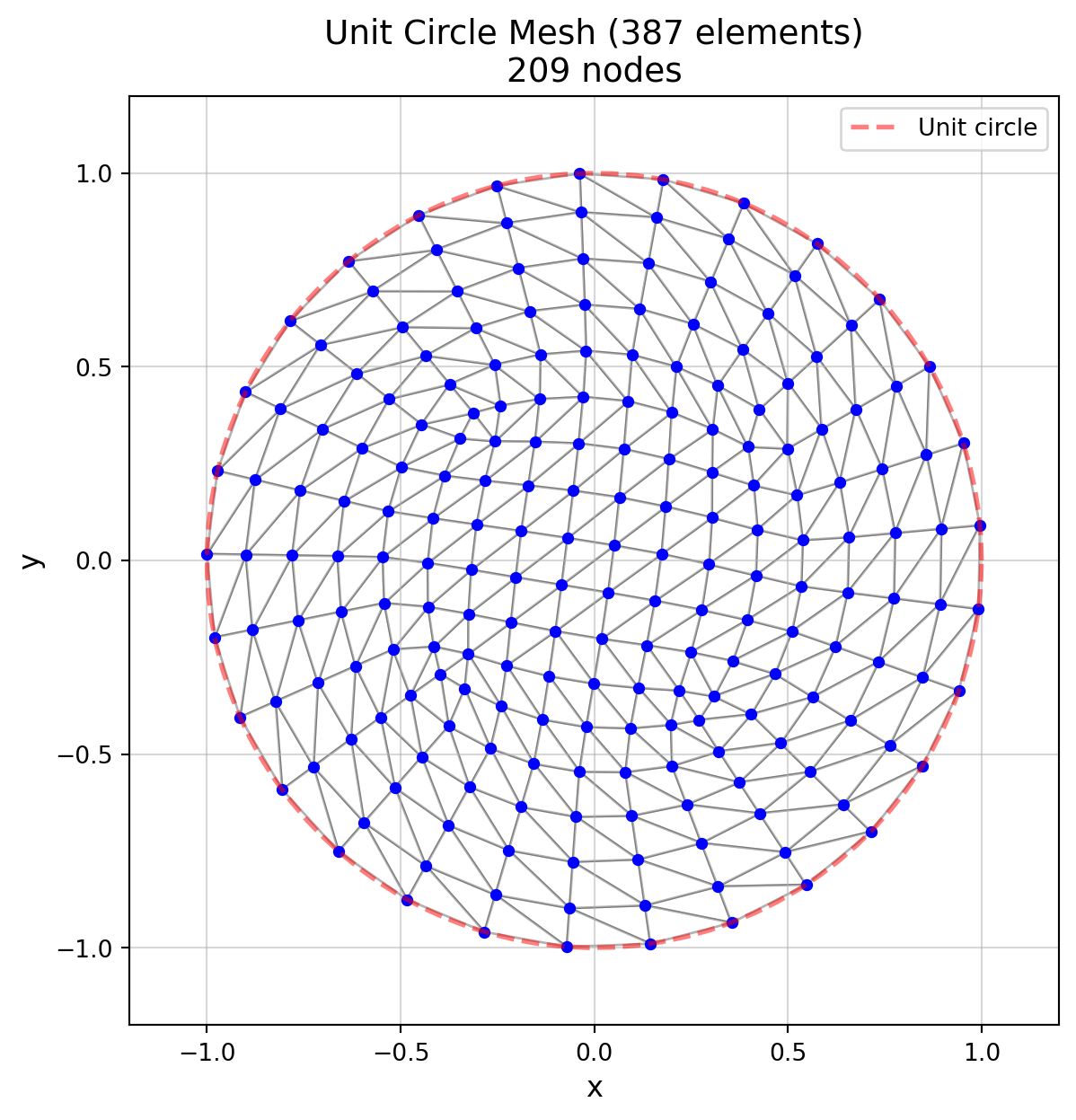 # Compute area using Mesh classarea_circle =0for iel, nodes, coords in mesh_circle.iter_elements():# iter_elements() yields: element_number, node_IDs, node_coordinates# Extract the three node coordinates for this triangular element n1 = coords[0] n2 = coords[1] n3 = coords[2]# Compute edge vectors and area u = n2 - n1 v = n3 - n1 w = np.cross(u, v) area_e =0.5* np.linalg.norm(w) area_circle += area_eprint(f"\nTotal computed area: {area_circle:.6f}")print(f"Expected area (π × r²): {np.pi:.6f}")print(f"Verification: Error = {abs(area_circle - np.pi):.6f}")print(f"Relative error: {100*abs(area_circle - np.pi) / np.pi:.4f}%")