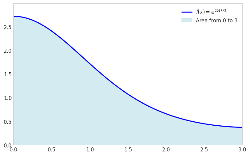 sp.integrate(f_expr, (x, x1, x2))\(\displaystyle \int\limits_{0}^{3} e^{\cos{\left(x \right)}}\, dx\)