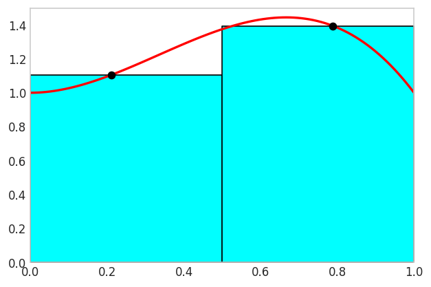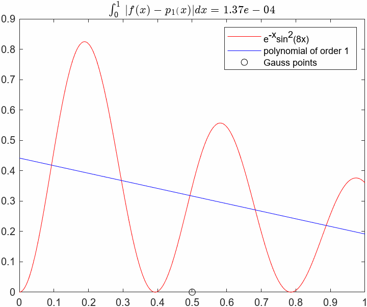 When \(f(x)\) is not a polynomial function, we still can approximate the integral by in a sense choosing the closest matching polynomial of the type \(p(x)=a_0+a_1 x+a_2 x^2+\ldots+a_n x^n\) and the corresponding Gauss quadrature rule to integrate this polynomial exactly.