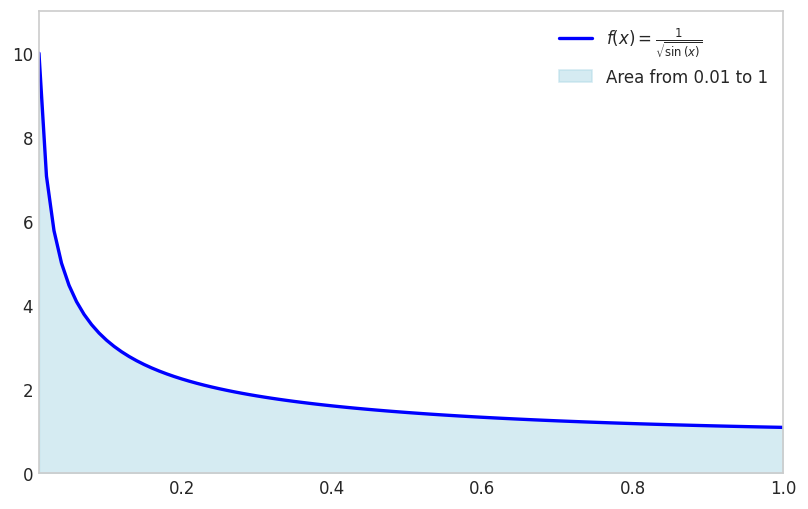 sp.integrate(f_expr, (x, x1, x2))\(\displaystyle \int\limits_{0.01}^{1} \frac{1}{\sqrt{\sin{\left(x \right)}}}\, dx\)