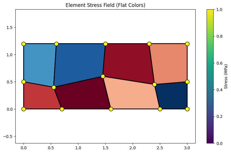 print(f"Stress range: {element_stresses.min():.1f} to {element_stresses.max():.1f} MPa")