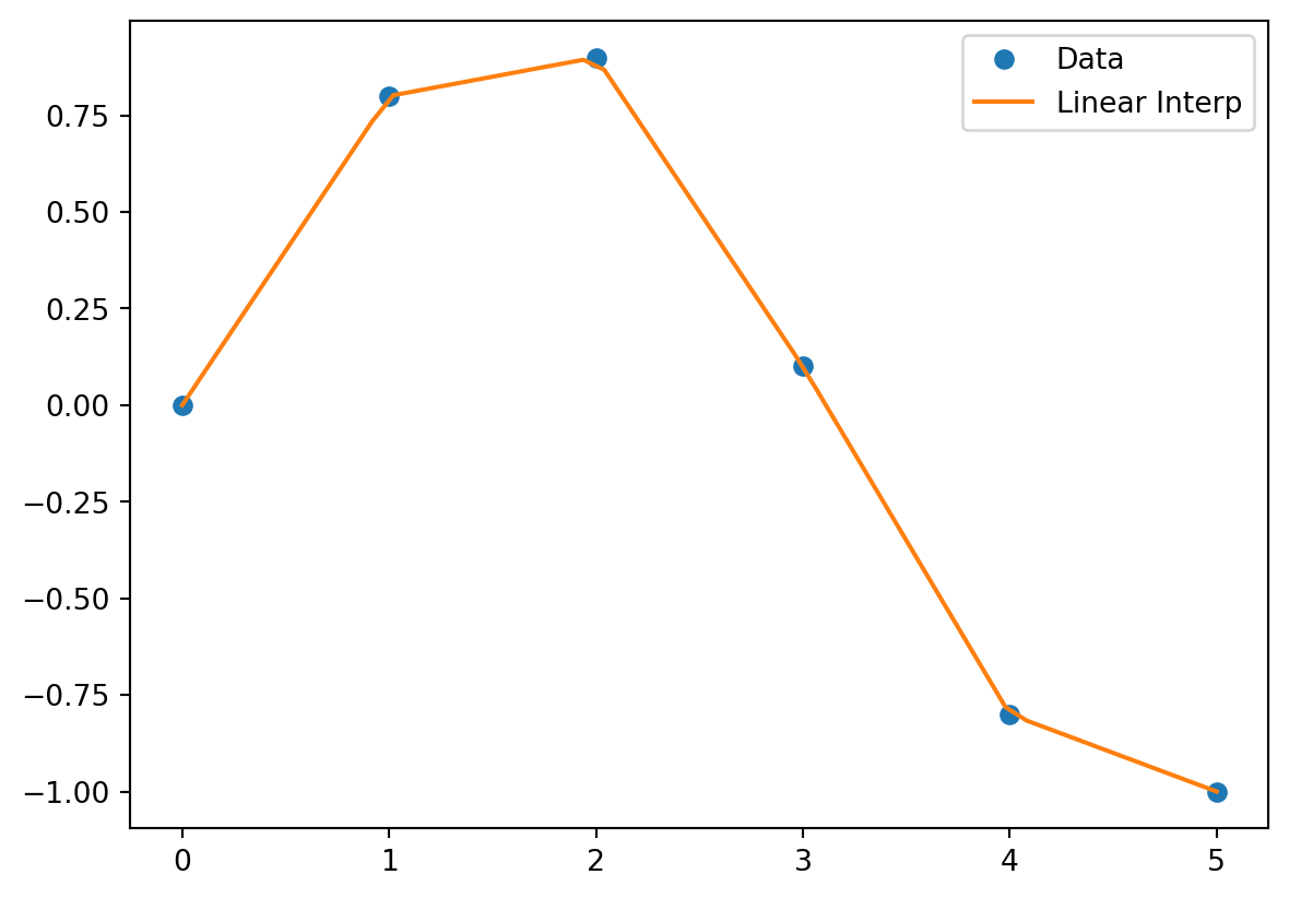 import numpy as npimport matplotlib.pyplot as plt# Known data pointsx = np.array([0, 1, 2, 3, 4, 5])y = np.array([0, 0.8, 0.9, 0.1, -0.8, -1.0])# Points where we want to interpolatex_new = np.linspace(0, 5, 50)# Linear interpolationy_linear = np.interp(x_new, x, y)plt.plot(x, y, 'o', label='Data')plt.plot(x_new, y_linear, '-', label='Linear Interp')plt.legend()plt.show()