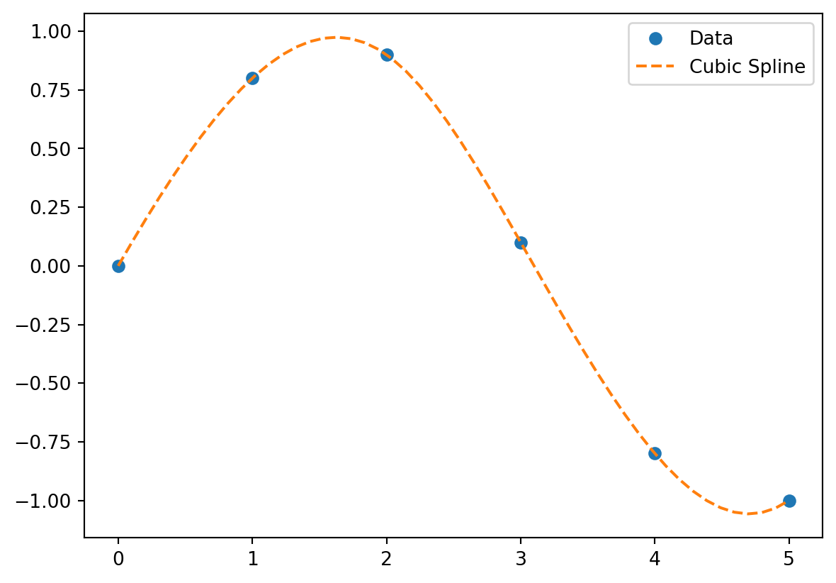 from scipy.interpolate import interp1d# Create an interpolation function (Cubic spline)f_cubic = interp1d(x, y, kind='cubic')# Evaluate at new pointsy_cubic = f_cubic(x_new)plt.plot(x, y, 'o', label='Data')plt.plot(x_new, y_cubic, '--', label='Cubic Spline')plt.legend()plt.show()