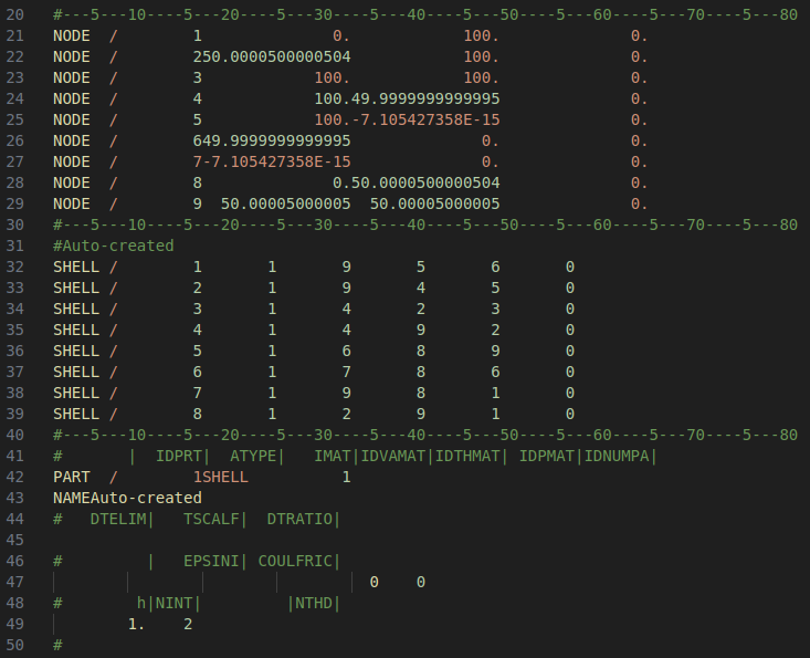 The code below initializes two empty lists: nodes and elements, then loops over each line of the file. Data is only appended to each list if a line begins with NODE or SHELL. Slicing is applied to collect only the relevant part of each line. Convince yourself about the slicing index by running for example print(str(line[6])), to see what it returns. Casting is used to specify the data type of each collected variable, and the function .strip() is used to clean up leading empty spaces (at the start) or trailing new-line characters (at the end). Note especially the order of each operation. Finally, after looping through all the lines in the file, the two lists are converted into numpy-arrays according to best practice, which enables much more efficient calculations using the stored data.